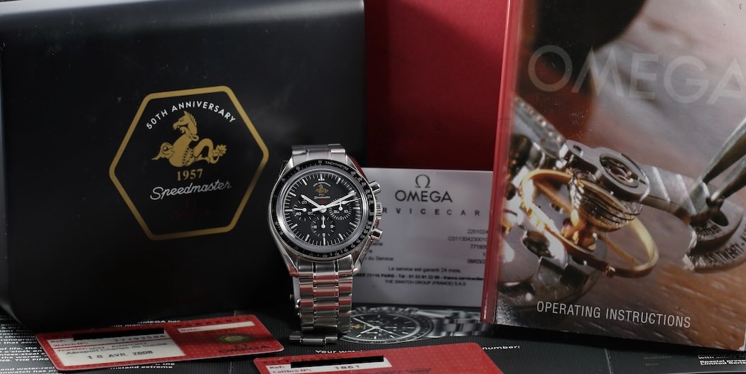 Omega Speedmaster Professional 50ᵉ anniversaire, édition limitée à 5 957 exemplaires, référence 311.30.42.30.01.001, vendue avec boîte et papiers d’origine
