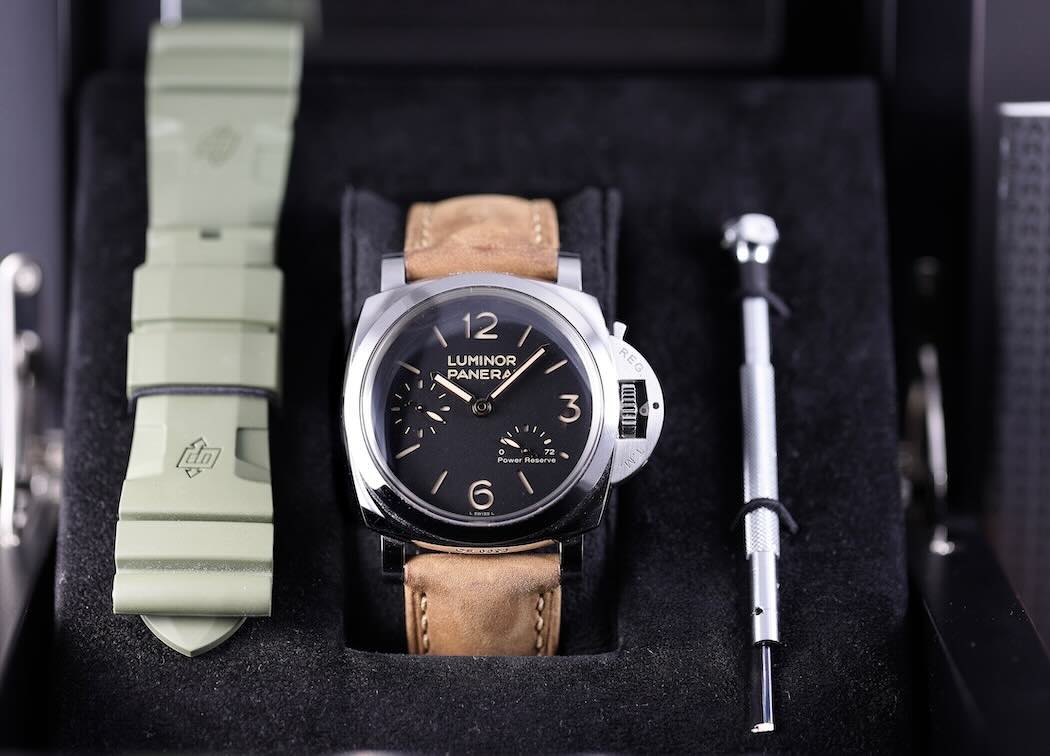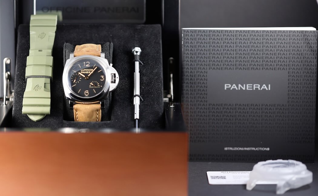 Contenu Livré  Boîte, papiers, tournevis, bracelet cuir d’origine + bracelet caoutchouc vert Panerai