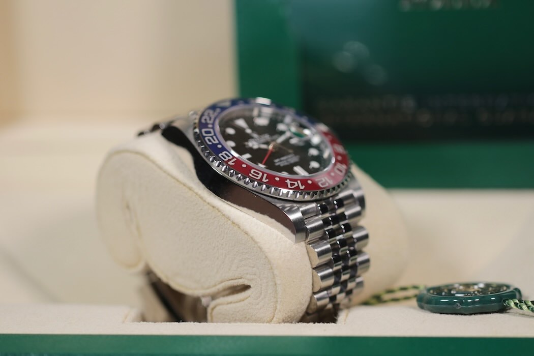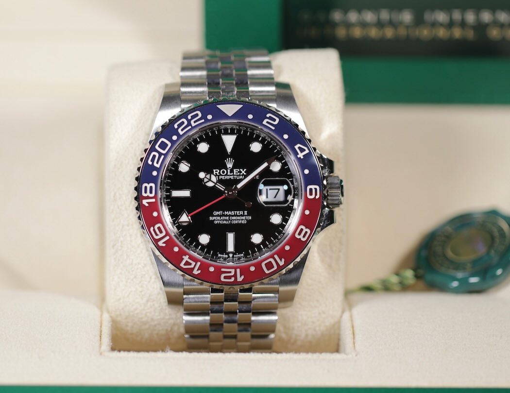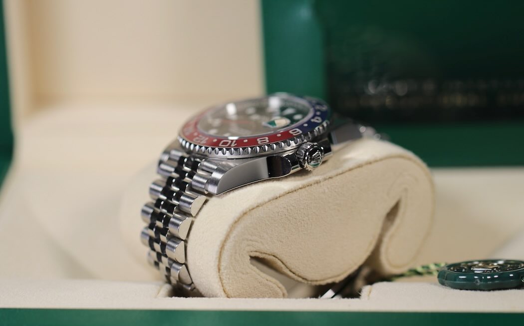 Modèle emblématique avec lunette bicolore rouge et bleue en céramique, bracelet Jubilé (ou Oyster selon ton modèle), et calibre 3285 offrant une réserve de marche de 70 heures.