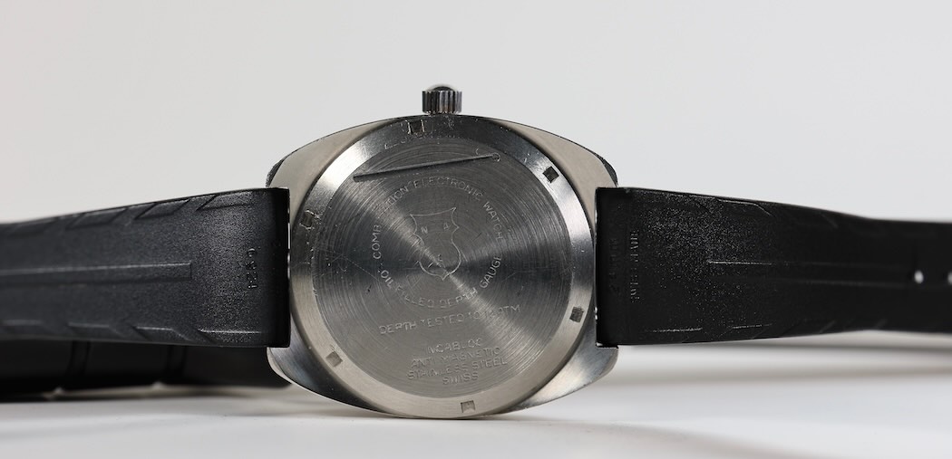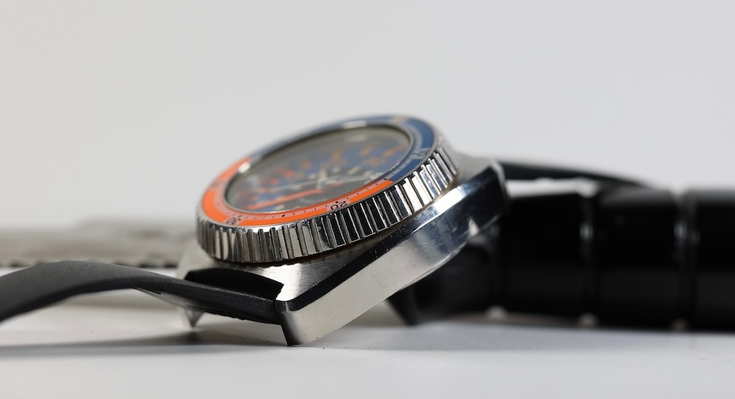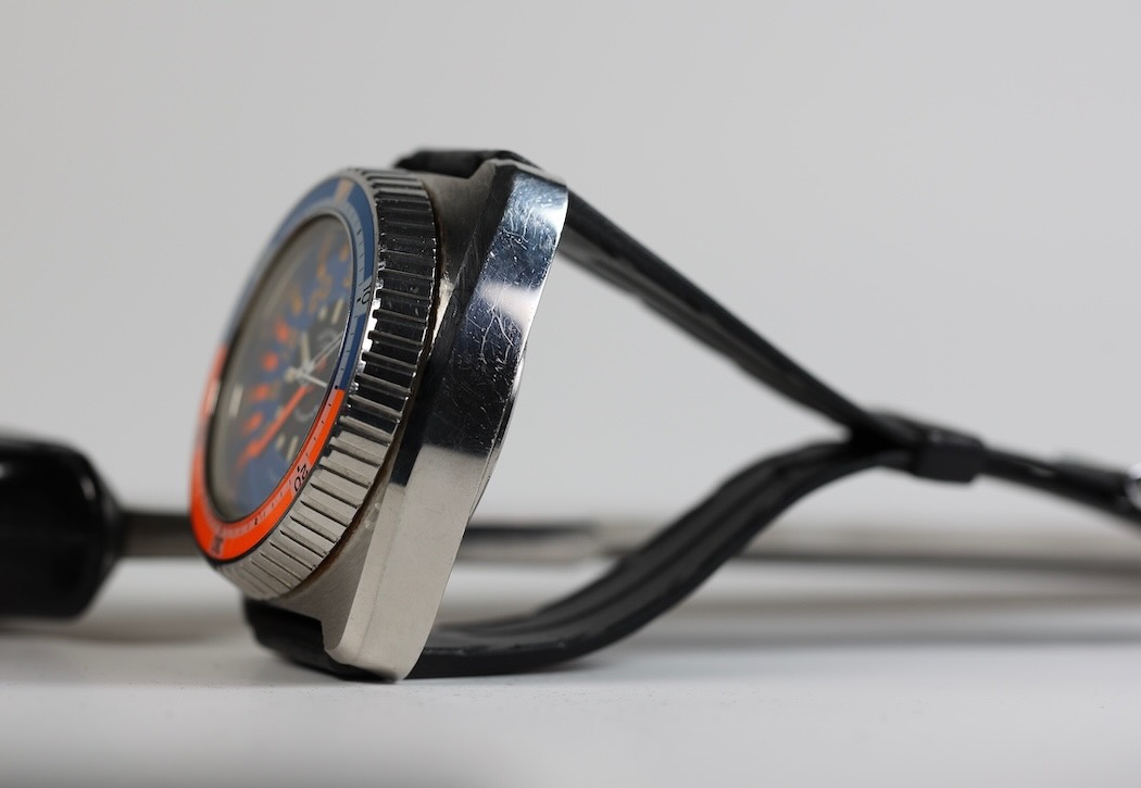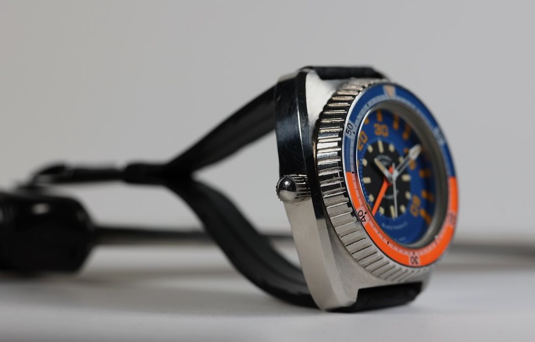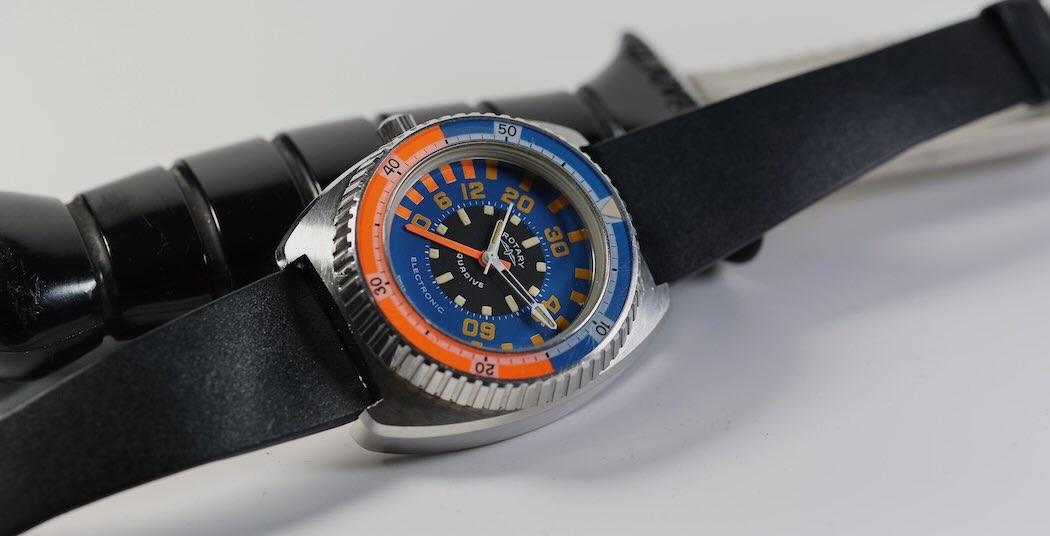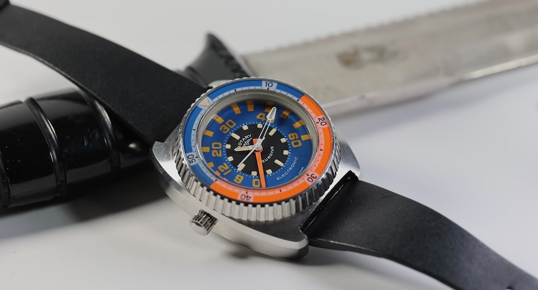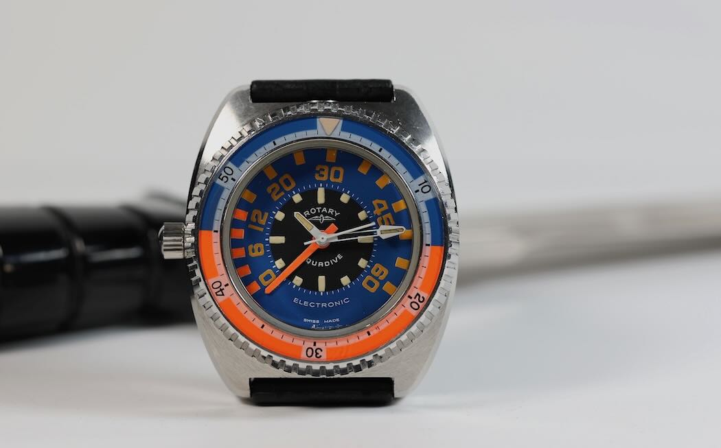 Rotary Aquadive Electronic avec profondimètre intégré, une montre de plongée vintage des années 70 au design typiquement coloré de cette époque.